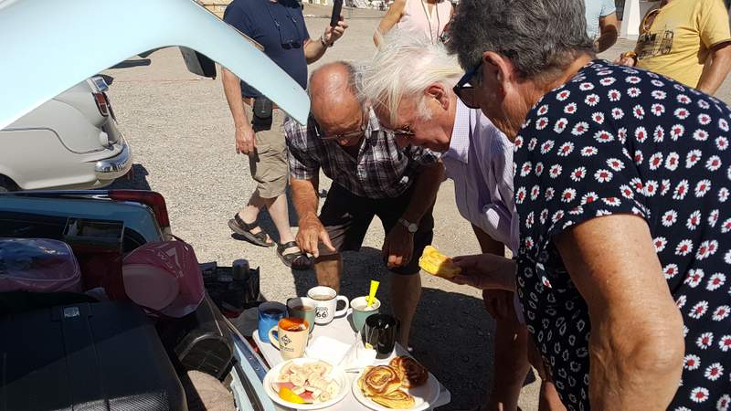 A call from Vincent and Frank. Their car broke down so Dale, Sharon, Randy and Cris returned with the trailer to find out what the problem was. Broken waterpump. They put the car in the trailer and brought it to the hotel where John replaced the pump and Thilo cleaned the radiator.